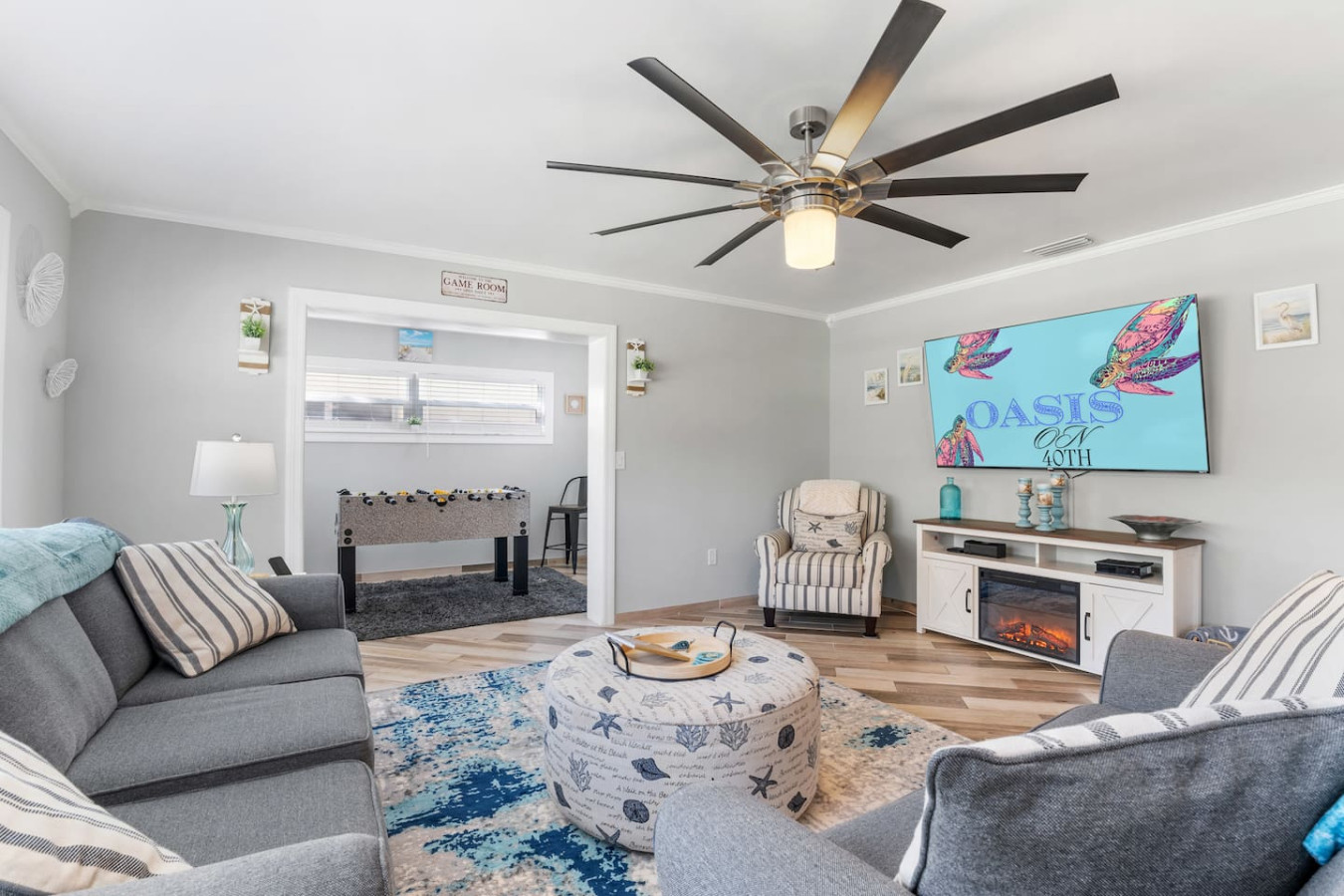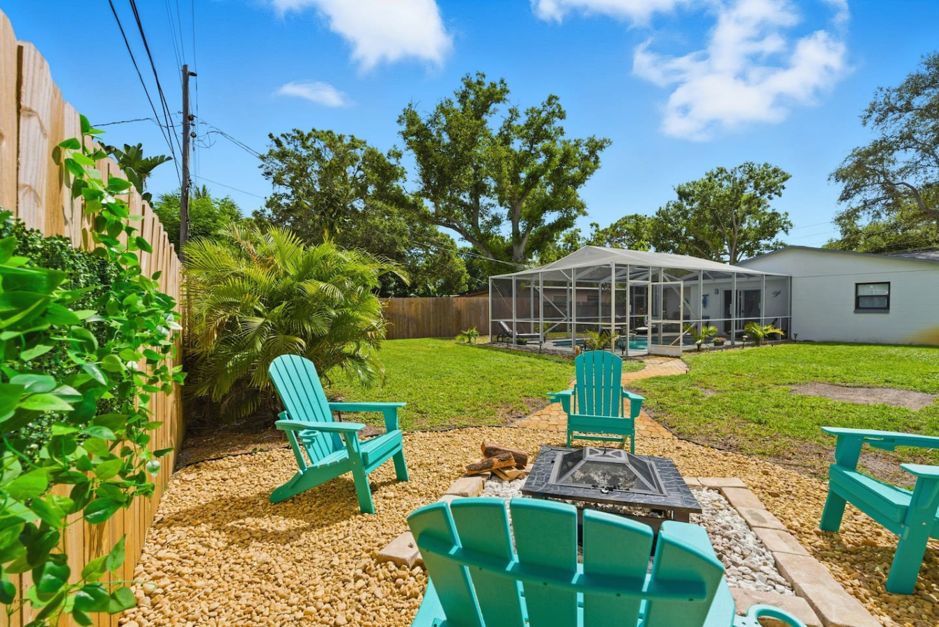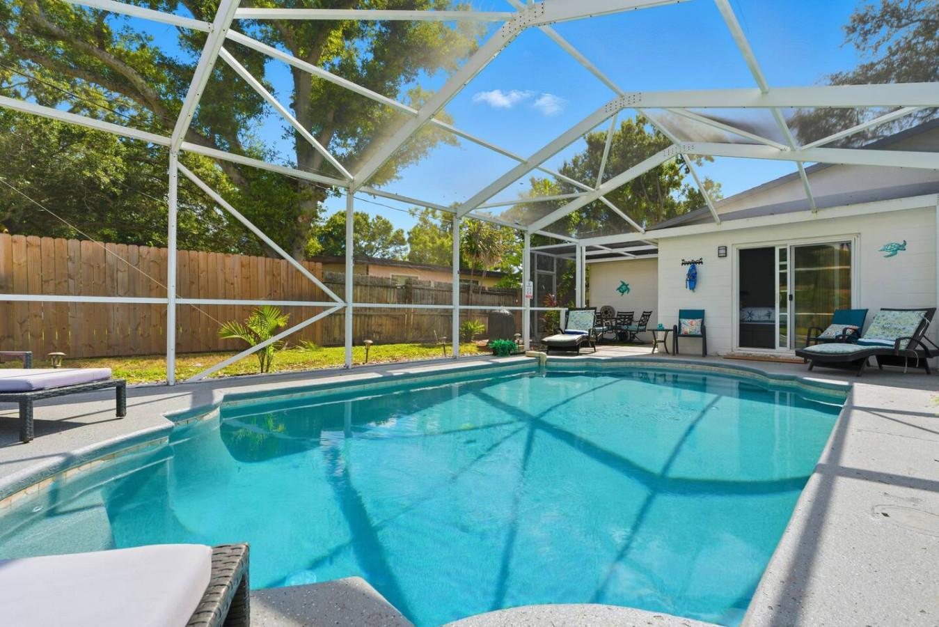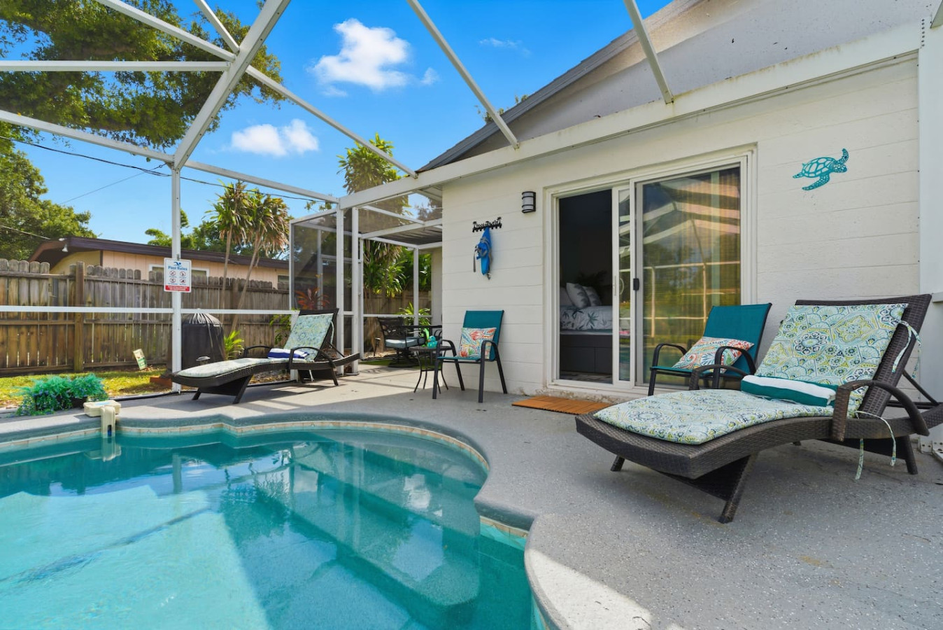 / nightWelcome to Paradise! This newly renovated, pet-friendly Oasis is perfect for family and friends. Immerse yourself in the stylish, serene beach atmosphere or unwind by the sparkling pool. St. Pete Beach, named Tripadvisor's No. 1 Beach in the U.S. in 2021, is just a few miles away. Vibrant downtown St. Petersburg is a short drive, offering exciting nightlife, delicious cocktails, great restaurants, and live music. Your dream vacation awaits! Oasis on 40th is nestled in a tranquil neighborhood of St. Petersburg, renowned for its dreamy beaches and year-round sunshine. Our home is just a short walk to a lovely neighborhood park and conveniently close to all the must-see attractions: ✴ Downtown Gulfport – 5 miles ✴ St. Pete Beach – 5 miles ✴ Tropicana Field (Tampa Bay Rays) – 7 miles ✴ The Chihuly Collection – 7 miles ✴ Downtown St. Petersburg – 8 miles ✴ The Dalí Museum – 8 miles ✴ Sunken Gardens – 6.5 miles ✴ Fort De Soto Park – 14 miles ✴ Clearwater Beach – 18 miles ✴ Raymond James Stadium (Tampa Bay Buccaneers) – 20 miles ✴ John's Pass Village & Boardwalk – 10 miles ✴ Boyd Hill Nature Preserve – 4 miles ✴ St. Petersburg Pier – 8 miles ✴ Vinoy Park – 8 miles ✴ Weedon Island Preserve – 12 miles ✴ Madeira Beach – 10 miles ✴ Sunset Beach (dog-friendly) – 6 miles ✴ Crescent Lake Dog Park – 7 miles ✴ Pass-a-Grille Beach – 6 miles ✴ Jet ski rentals and deep-sea fishing – nearby KEY AMENITIES ✴ Newly renovated home ✴ All-new furniture ✴ Keyless entry ✴ Pet-friendly ✴ Swimming pool (with lounge chairs) ✴ Pool towels ✴ Patio ✴ Outdoor lounge & dining areas ✴ BBQ grill ✴ Fully-equipped kitchen with island ✴ Coffee bar (coffee pot, gourmet K-cup coffee pods, variety of tea bags, creamer, sugar & stevia) ✴ Bath amenities ✴ Luggage stands ✴ High-speed Wi-Fi ✴ 4 Smart TVs ✴ Washer/dryer with detergent & dryer sheets ✴ Central AC & heat ✴ Parking on premises ✴ Dog bowls/mat See the amenities section with icons for a full list. LIVING ROOM Imagine a cozy, beachy living room with a fireplace as the focal point, creating a warm and inviting atmosphere. Above it, a smart TV is perfect for movie nights or watching your favorite shows. The room is filled with comfortable furniture and light, airy colors reminiscent of a beach house retreat. A stylish fireplace credenza adds to the charm and functionality. It's the ideal space to relax and unwind after a long day of sun and fun. KITCHEN & DINING ROOM Imagine a charming kitchen where turtle decor brings a unique and playful touch to the space. Adorable turtle-themed accents, including ceramic figurines, wall art, and patterned dish towels, add a whimsical feel. The overall ambiance is both inviting and fun, making this kitchen a perfect blend of functionality and personality. It is fully equipped with all kitchen amenities, ensuring you have everything you need to make your perfect breakfast, lunch, or dinner. 3 BEDROOMS Each bedroom features a smart TV, but what truly sets them apart is their unique charm: ✴ Bedroom 1 – Drift off to sleep in the tropical decor of the primary bedroom with a king bed. The palm trees outside continue inside, creating a serene oasis. This room offers complete access to the outdoor pool area and ample underbed storage. ✴ Bedroom 2 – This tropical bedroom boasts a queen bed and a beachy vibe, perfect for unwinding after a fun-filled day. It also features plenty of underbed storage and a large closet. ✴ Bedroom 3 – Let the young ones drift off to sleep in this sea-inspired decor. It feels like sleeping in an underwater paradise! This room is set up with 2 full beds and offers plenty of closet space and a dresser for all your belongings. 2 FULL BATHROOMS The primary bathroom features a luxurious dual rainforest shower head, providing a refreshing and immersive way to start or end your day. Paired with waterfall sinks, it creates a spa-like ambiance perfect for relaxation and rejuvenation. This stylish bathroom retreat is the ultimate combination for soothing and unwinding. The second full bathroom, decorated with charming seagulls, offers a tranquil escape with soft ambient lighting. Both bathrooms are equipped with all the amenities you need, including soap, shampoo, conditioner, and a hairdryer BACKYARD AND POOL OASIS Step into a backyard paradise in Florida, where a stunning pool oasis awaits. The crystal-clear water glistens under the warm sun, inviting you to sit back and relax in the privacy of lush tropical plants and palm trees. Comfortable lounge chairs, pool towels, and fun pool toys are provided, creating perfect spots for relaxation and sunbathing. Pool is ONLY heated from October to February for an extra charge, please ask us 🙂 The spacious backyard is perfect for outdoor games like corn hole and volleyball, kick ball or golf, fully fenced for privacy, offers a patio table suitable for outdoor dining, adding to the fun and excitement. As the evening sets in, gather around the cozy fire pit in the backyard. The warm glow of the flames creates an enchanting setting for roasting marshmallows and making s'mores or sharing stories. It's the ideal spot to create lasting memories with friends and family under the starlit sky. GAME ROOM Step into a lively game room, where the energy is palpable, and the fun never stops. This room creates an exciting atmosphere that beckons you to play. The centerpiece is a high-quality foosball table, surrounded by comfortable seating for spectators and players awaiting their turn. The sound of the ball clinking against the rods and the cheers of friendly competition fill the air. It's the perfect space for friends and families to gather, challenge each other, and create lasting memories. Not into foosball? Challenge your friends to a game of darts (don't worry, mom—they're magnetic). This room also offers shelves filled with a variety of games, from board